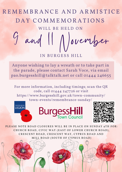 | Details | The Armistice Day Commemoration Service will take place on Tuesday 11 November, at 10.45am during which the Town Mayor will lay the People’s Wreath at the base of the town’s War Memorial. Councillors, Royal British Legion members, and Town Council Staff will march from the Help Point in Church Walk to the War Memorial, where there will be a short ceremony and 2 minutes silence. This year, the People’s Wreath offers a special opportunity for community involvement. Starting Monday 27 October residents can visit the Burgess Hill Town Council Help Point at 96 Church Walk to fill the wreath with Remembrance Day poppies in memory of all who have lost their lives in conflicts around the world. Contributions will be accepted until the day of the commemorative service before the service is held. For more information about the events, please contact the Burgess Hill Town Council Community Events team on 01444 247726 or pop into the Help Point at 96 Church Walk. SERVICE SHEETSService sheets from both events can be downloaded below:Remembrance Sunday Service Sheet Civic Service (to be held in St John’s Church) Armistice Day Service Sheet |