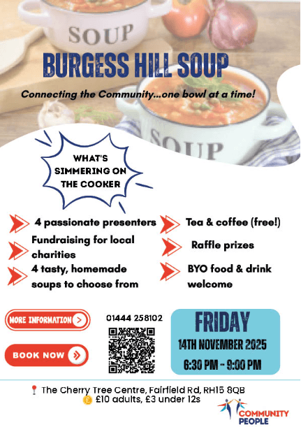 Think Dragon’s Den, but with fewer millionaires, more soup and a room full of local heroes. That’s Burgess Hill Soup - a community-powered evening of ideas, laughter, lentils and the occasional raffle win. Burgess Hill Soup is the ultimate culinary-meets-community event and a delicious way to change the world. Bringing together good people, good ideas and letting the audience decide who gets the cash. Think of it as community with carrots & croutons. Come and join in…. you might meet like-minded people or discover a project you’re passionate about - one you’d like to support and get involved in by making an additional donation, offering your skills, giving equipment, space, volunteering… Here’s how it simmers down: 6.15pm: Doors open at the Cherry Tree Centre 6.45pm: Four brave local souls pitch for their grassroots projects - 5 minutes each, no PowerPoint required. Questions from the audience are encouraged. 7.30pm: Soup’s on! Four hearty, homemade soups crafted from surplus food - veggie, vegan, gluten-free – we’ve got you covered. It’s potluck too, so bring something to share if you fancy, and yes, you’re absolutely allowed to bring your own snacks and wine.Throughout: Mingle, natter, debate who gets your vote. Pitchers will circulate – think speed dating but with more chickpeas.Entertainment: A local musician will provide the intermission tunes.The Big Vote & Raffle Draw: Cast your ballot. Cross your fingers. Win a prize. 8.30pm: And the winner is…the project with the most votes. They receive all the night’s ticket sales and donations. Come for the soup…stay for the stories…leave having done something brilliant for your neighbourhood… Book via: Eventbrite Age Range:All ages welcome