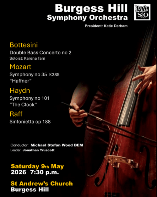 Burgess Hill Symphony Orchestra presents a selection of classical favourites, including Bottesini’s virtuoso Double Bass Concerto no 2, Mozart’s Symphony number 35 K385 (“The Haffner”), Haydn’s Symphony number 101 (“The Clock”) and Sinfonietta op. 188 by Raff. The concert is on Saturday 9 May 2026, starting at 7:30pm. It will take place in St Andrew’s Church, Burgess Hill.