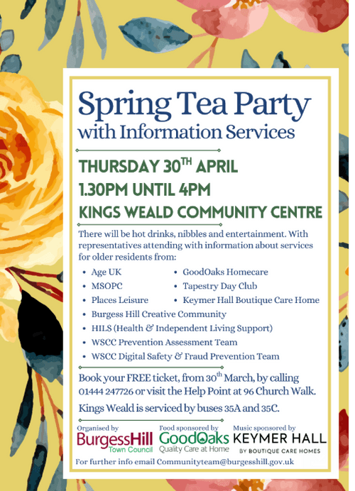 | Details | You’re are invited to Burgess Hill Town Council’s Spring Tea Party, with nibbles, hot drinks, and musical entertainment from Keziah! It will be held at Kings Weald Community Centre, on Thursday 30th April, from 1.30pm to 4pm. There’s free parking right outside or the venue is serviced by buses 35c and 35a. FREE tickets can be booked, via the Help Point at 96 Church Walk or by calling 01444 247726. As an addition to the tea party, ten local organisations who provide services to older residents will be attending with information for you! Including Age UK, WSCC Prevention Assessment Team, and MSOPC. Burgess Hill Creative Community will be bringing information about their craft groups and WSCC Digital Safety & Fraud Prevention Team will speak about how to keep yourself safe from fraud. You can also expect representatives from Places Leisure and Tapestry Day Club. HILS will also join us, to talk about the independent living support they can provide. GoodOaks Homecare, who have kindly paid for the food, and Keymer Hall Boutique Care Home, who have sponsored the musical entertainment, will have representatives in attendance too. PLEASE NOTE: Priority will be given to Burgess Hill residents, should there be any availability, non-residents will be able to book the week prior to the tea party. |
