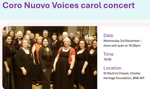 The charming Coro Nuovo Voices are welcomed back to Chailey Heritage Foundation, returning for their third carol concert!Join them for a festive and heartwarming evening of Christmas carols, choral arrangements and readings in the gorgeous St Martin’s Chapel, onsite at Chailey Heritage Foundation. 🌟 Sing along to your favourite carols📖 Delight in festive readings and poems🎼Experience the magic of live choral musicBring your friends and family for an evening full of joy, music and Christmas spirit! All funds raised will go directly towards making a difference for the children and young people at Chailey Heritage Foundation. Places are limited so book your ticket early to avoid disappointment! Your ticket includes a complimentary glass of mulled wine or apple juice, along with a festive mince pie to enjoy during the evening. Doors open at 6.30pm for a 7pm start. Free parking is available on site.