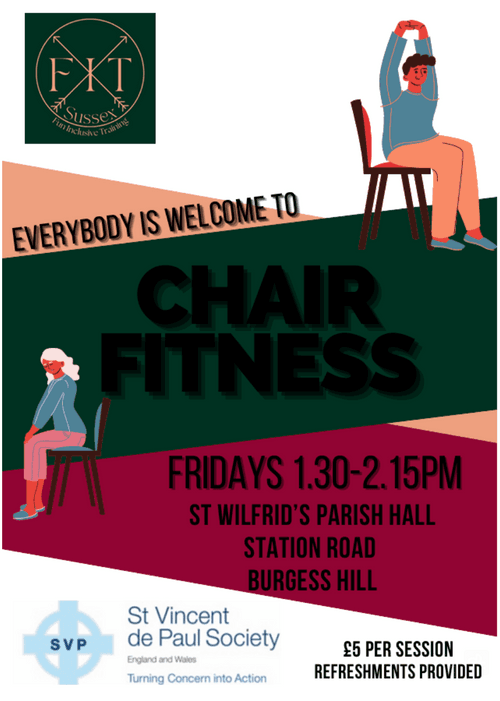 | Details | You've heard of Chair Fitness, here is your chance to try it out at St Wilfrid's Parish Hall, Station Road, Burgess Hill 1:30pm every Friday. The trainer, Karla Bishop offers a full-body workout to music that you may recall, go at your own pace, lots of laughter along the way. All welcome to join. |