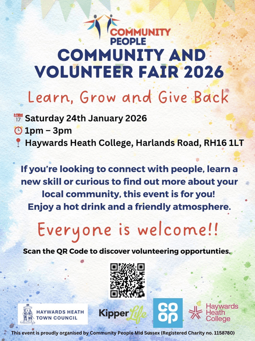 | Details | Kick off 2026 with purpose and impact. Join in at the Community Volunteer Fair and discover how your business can empower employees, support local causes, and lead the way in creating a stronger community. Also, if you're looking to connect with people, learn a new skill or curious to find out more about your local community, this event is for you. You will be able to enjoy a hot drink in a friendly atmosphere. This event is proudly organised by Community People Mid Sussex (Registered Charity No.1158780). For further information about Community People Mid Sussex please visit: www.communitypeople.org.uk |