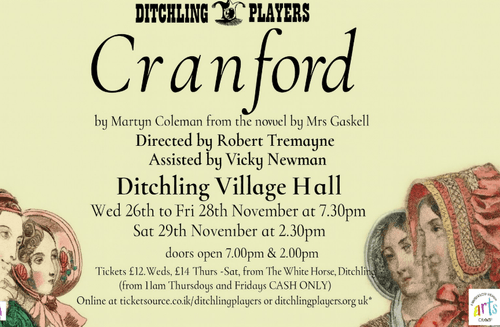 Ditchling Players present Cranford, by Martyn Coleman from the novel by Mrs Gaskell from Wednesday November 26th to Saturday November 29th. Wednesday to Friday at 7:30, Saturday at 2:30pm. Doors open at 2.00pm and 7.00pm.