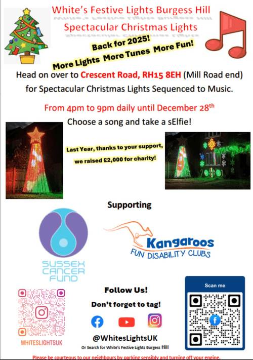 Not to be missed! Keep up to date at "White's Festive Lights Burgess Hill" on instagram or facebook.