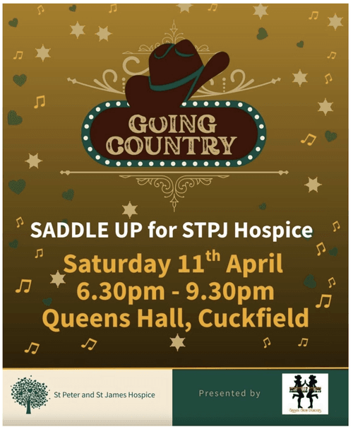 Saddle Up for a Night of Country Fun for a Great Cause. Put on your boots and join for a toe‑tapping evening in support of St Peter & St James Hospice at Go Country on Saturday 11th April, from 6.30pm – 9.30pm in the Queens Hall, Cuckfield04. Enjoy the fabulous Nashville Night Stage Show, before hitting the dancefloor yourself as you can line-dance the night away. Whether you're a seasoned dancer or a complete beginner, everyone is welcome - it's all about having fun all in the name of an incredible local cause. So grab your friends, embrace the country vibes, and join in for a lively hoedown. Find our more and sign up here: https://buytickets.at/stpeterstjameshospiceinchaileysussex/2035600
