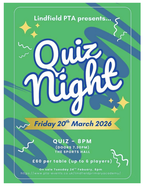 | Details | Lindfield PTA presents a Quiz Night on Friday March 20th at 7:30pm. Quiz starts at 8pm. Have you got your quiz team together yet? Tickets go on sale 24th February and with limited availability, it's very much fastest fingers first Think Harry Styles ticket levels of demand Don't say you weren’t warned — get your team ready and be quick! |