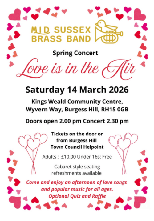On Saturday 14 March, Mid Sussex Brass Band will be performing a range of popular music themed around ‘love’. This will include songs from shows, pop songs and traditional pieces and will feature many of their soloists. This will take place at Kings Weald Community Community Centre, with doors opening at 2.00 pm for a 2.30 pm performance and the tickets are £10 (under 16’s free with paying adult). Tickets can be purchased from Burgess Hill Town Council Help Point or at the door. Come along and enjoy an afternoon of entertainment. Seating will be Cabaret Style and there will be refreshments available. We will also test your knowledge of the tunes we are playing (optional) and there will be a raffle.