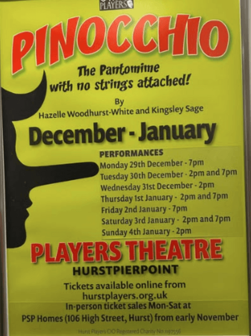 | Details | From December 29th to January 4th, the Hurst Players will bring you Pinnocchio, the Panto with no strings attached at The Players Theatre in Hurst. This is a new adaption of the classic story of a puppet who wishes to become a real boy. In this fresh, modern re-telling of a boys innocence, we embrace the ideas of 'Green Theatre', exploring today's challenges of good verses evil, all beautifully wrapped up in a highly engaging story complete with fairies, talking whales, heroes and naughty villains, to entertain and delight children and grown ups alike. A magical mix of storytelling and new musical numbers, sprinkled with the important ingredients for sustainability, accountability, and caring for our environment and community. |