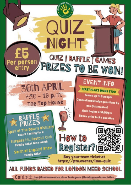 | Details | London Meed Association will be hosting a Quiz Night on Thursday 30th April at The Top House in Burgess Hill. From 7.30 to 10pm Led by a professional Quiz Master, you and your teammates can look forward to a fun night of friendly competition while testing your general knowledge and hopefully winning some amazing prizes, including £100 for first place, plus a bonus Lucky Question prize. There will also be games and a raffle taking place throughout the evening. Raffle prizes include; Tour and tasting for 2 at Spirit of the Downs Distillery A Burgess Hill Football Club family match ticket and a family ticket to the South of England Show (in June) Tickets are £5 per person. with all funds raised going towards supporting London Meed School. For more information and to book a team ticket for up to 6 people; visit their website; pta.events/lma-quiz |