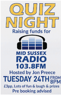 | Details | Join them at The Windmill with host Jon Preece for a fun filled night. Please book your tables as early as possible to avoid disappointment! This month's quiz is an aid of Mid Sussex Radio, this station is run completely by volunteers for the benefit of the local community, raising lot of money for local groups and charities with their roadshow and show cases. |