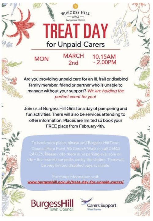 The Treat for Unpaid Carers Day is hosted by Burgess Hill Girls, and co-organised by Burgess Hill Town Council, with sponsorship by Carers Support West Sussex.