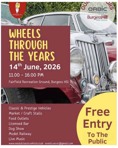 Wheels Through the Years return in 2026 to Fairfield Recreation Ground in Burgess Hill on June 14th, from 11am to 4pm. Classic and prestige vehicles as always along with lots of additional entertainment. Market and craft stalls, food outlets, licensed bar, a dog show, a model railway and live music. Mire details nearer the event.