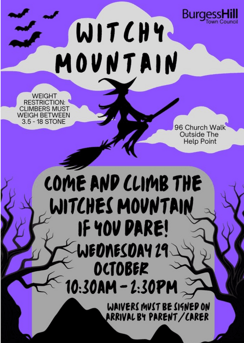 | Details | Witchy Mountain is returning this Halloween on Wednesday 29 October, do you dare to climb the witches mountain? Located outside the Help Point from 10:30am – 2:30pm, a waiver must be signed on arrival by a parent or carer and weight restrictions apply, climbers must weigh between 3.5 – 18 stone. For more information on any of these events contact Communityteam@burgesshill.com or call 01444 247726. |