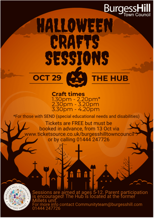 | Details | On Wednesday 29 October at The Hub, (former Millets unit) we will be running Halloween craft sessions. These sessions are aimed at children aged 5-12, with a separate SEND (special educational needs and disabilities). Spaces must be booked in advance. Tickets can be booked via www.ticketsource.co.uk/burgesshilltowncouncil or bycalling 01444 247726 Craft Sessions1:30 – 2:20 *SEND session2:30 – 3:203:30 – 4:20 Please note there is no onsite parking and the nearest paid car parks are the Multistorey and Waitrose Car Parks, also if The Hub is not available, the craft sessions will take place at Burgess Hill Theatre Club, 98 Church Walk, Burgess Hill, RH15 9AS. |